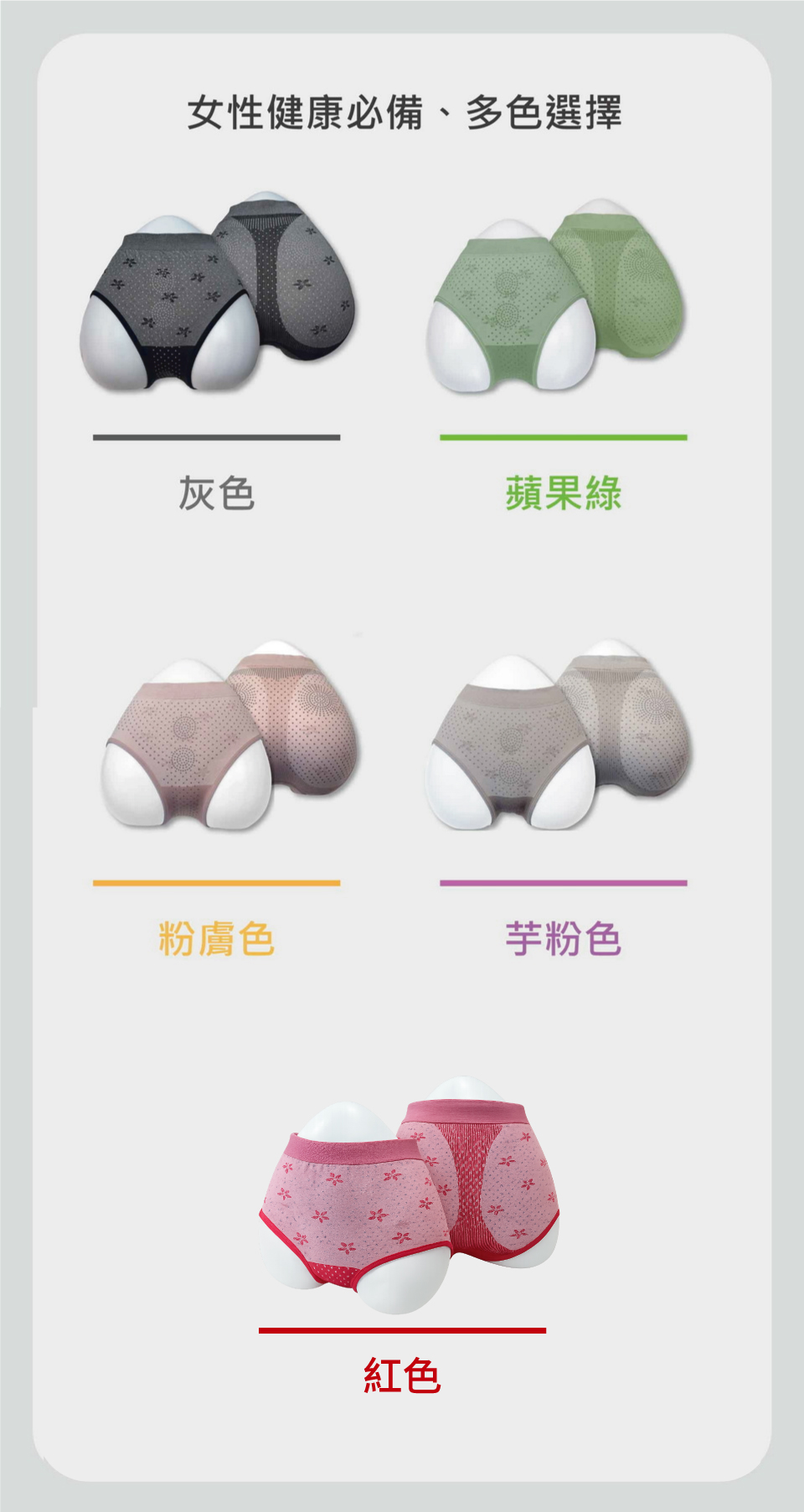 1.石墨烯灰色 2. 蘋果綠色 3. 粉膚色 4.芋粉色5.紅色
