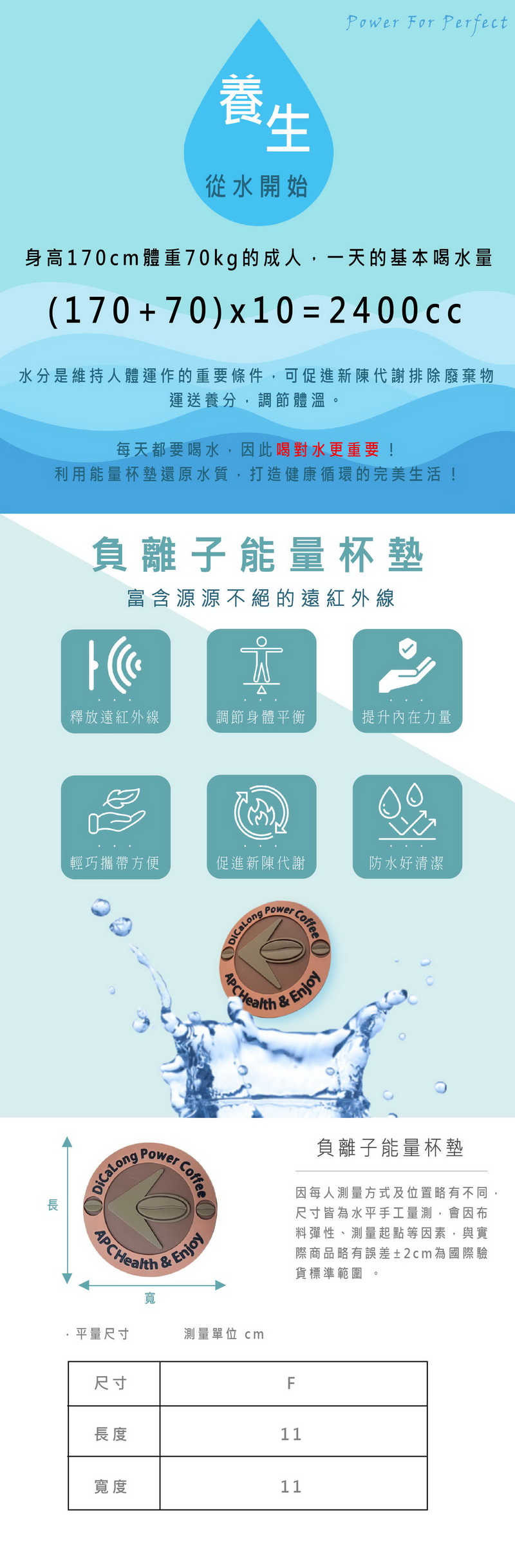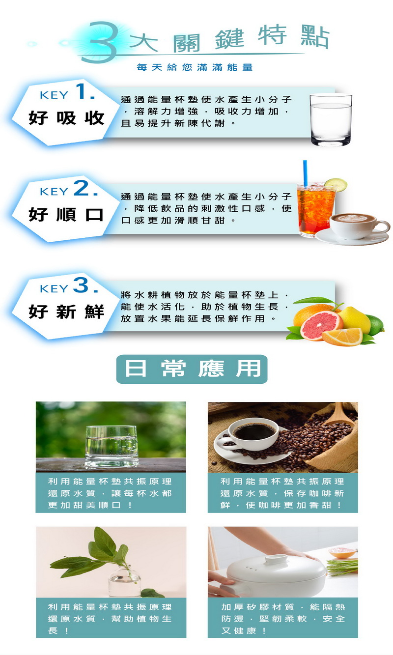 ‧ 促進新陳代謝:通過能量杯墊使水產生小分子,溶解力提升,吸收力增強,活化新陳代謝功能。