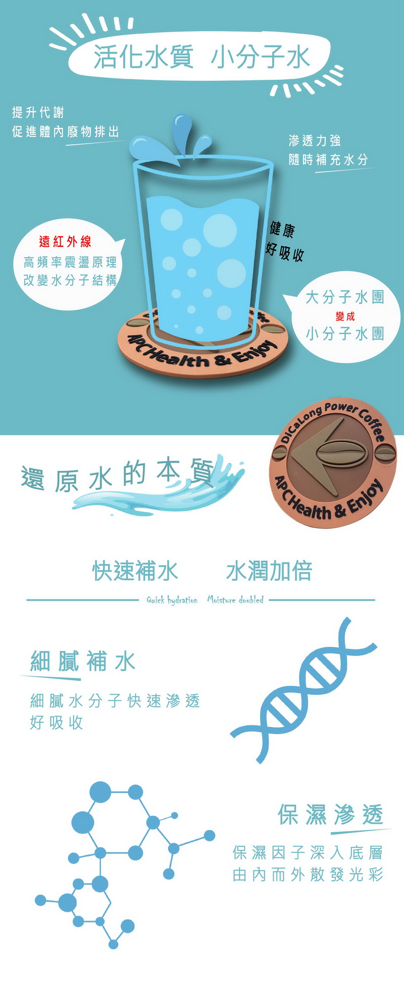 ‧ 細膩補水:通過能量杯墊使水產生細膩的小分子,增加滲透力,讓喝進去的水更好吸收。