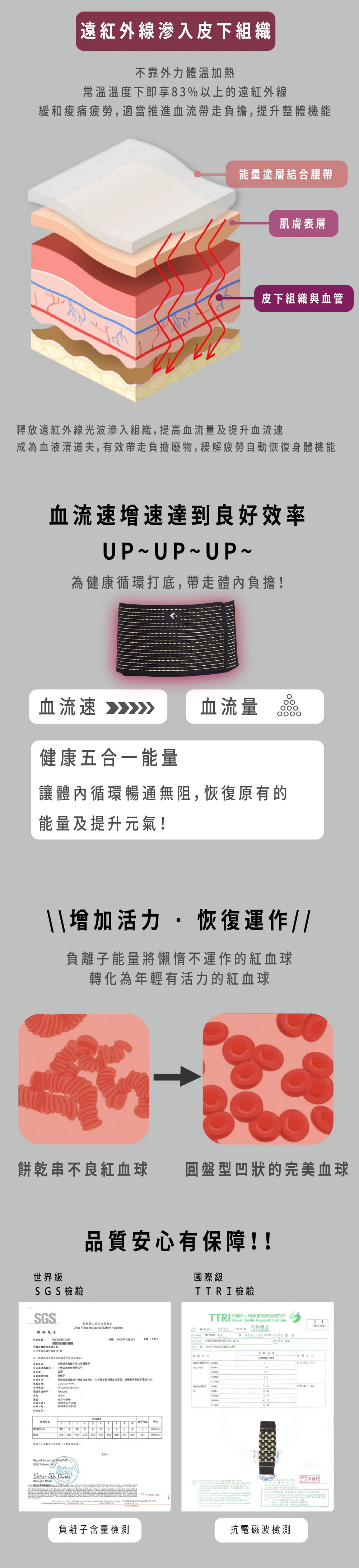 · 能量自動蓄熱:使用鈦、鍺、電氣石,釋放↑遠紅外線、負離子,常溫釋放率全波段83%以上,深層溫敷腰部,舒緩疲勞。